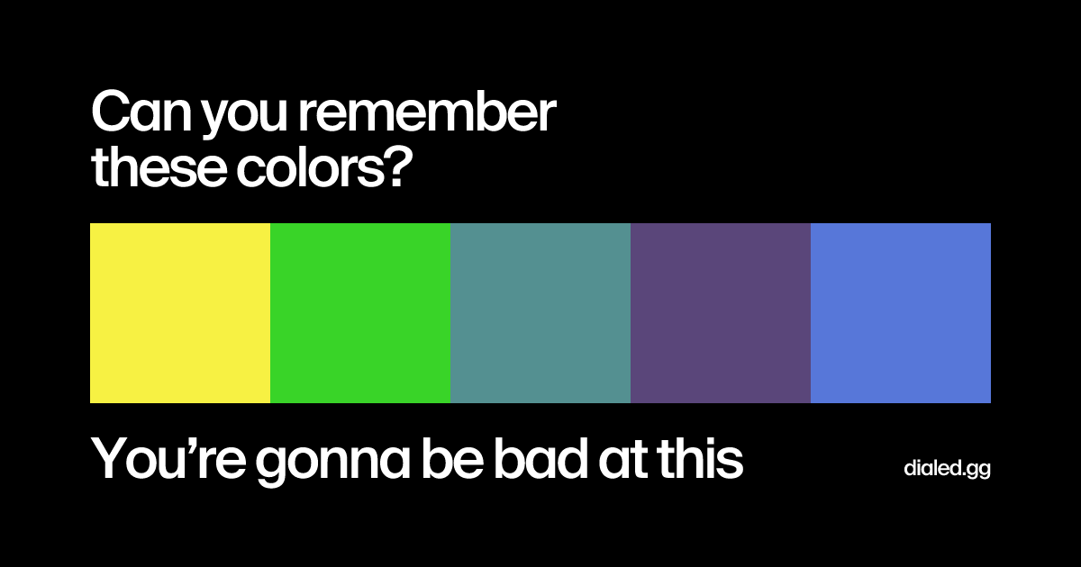 The Color Game. “Humans can’t reliably recall colors. This is a simple game to see how good (or bad) you are at it. We’ll show you five colors, then you’ll try and recreate them.” I scored 39/50 but got a perfect score on one color. https://dialed.gg/